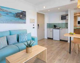 Las Suites cuentan con dormitorio independiente renovado con dos camas individuales de 90 x 190 cm o cama de matrimonio de 160 x 190 cm. El salón comedor cuenta con una Smart TV de 40”, un sofá cama de 190 cm de ancho para dos personas y una mesa con sillas. Además, cuenta con baño privado con ducha y una terraza amueblada con mesa y sillas.